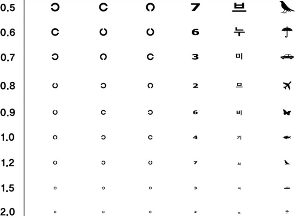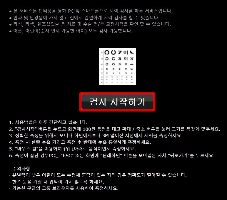 이 시력 검사표는 구글의 크롬 브라우저가 최적화되어 있다고 하니 가능하다면 크롬을 이용하여 인터넷 시력검사를 해주세요.